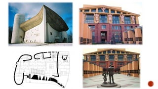 The document discusses the revival of Greek architectural styles in the mid-18th century, emphasizing a return to classical purity as a reaction against Rococo and Baroque aesthetics. It highlights key figures such as Andrea Palladio and Robert Adam, who influenced the development of neoclassical architecture characterized by symmetry, colonnades, and pediments. The text also contrasts modernism and postmodernism in architecture, emphasizing the latter's reintegration of ornamentation and historical references.