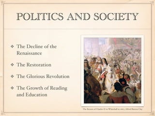 The Neoclassical period in England spanned the 17th and 18th centuries, beginning with the Restoration of the monarchy under Charles II in 1660 after the English Civil War and Protectorate of Oliver Cromwell. This period saw a return to classical ideals of form and reason in the arts and literature, as well as the rise of the middle class and increased literacy and education. Major literary movements included the Metaphysical Poets in the 17th century known for intricate imagery and philosophy, and Augustan writers in the early 18th century like Alexander Pope and Jonathan Swift who used satire and reason.
