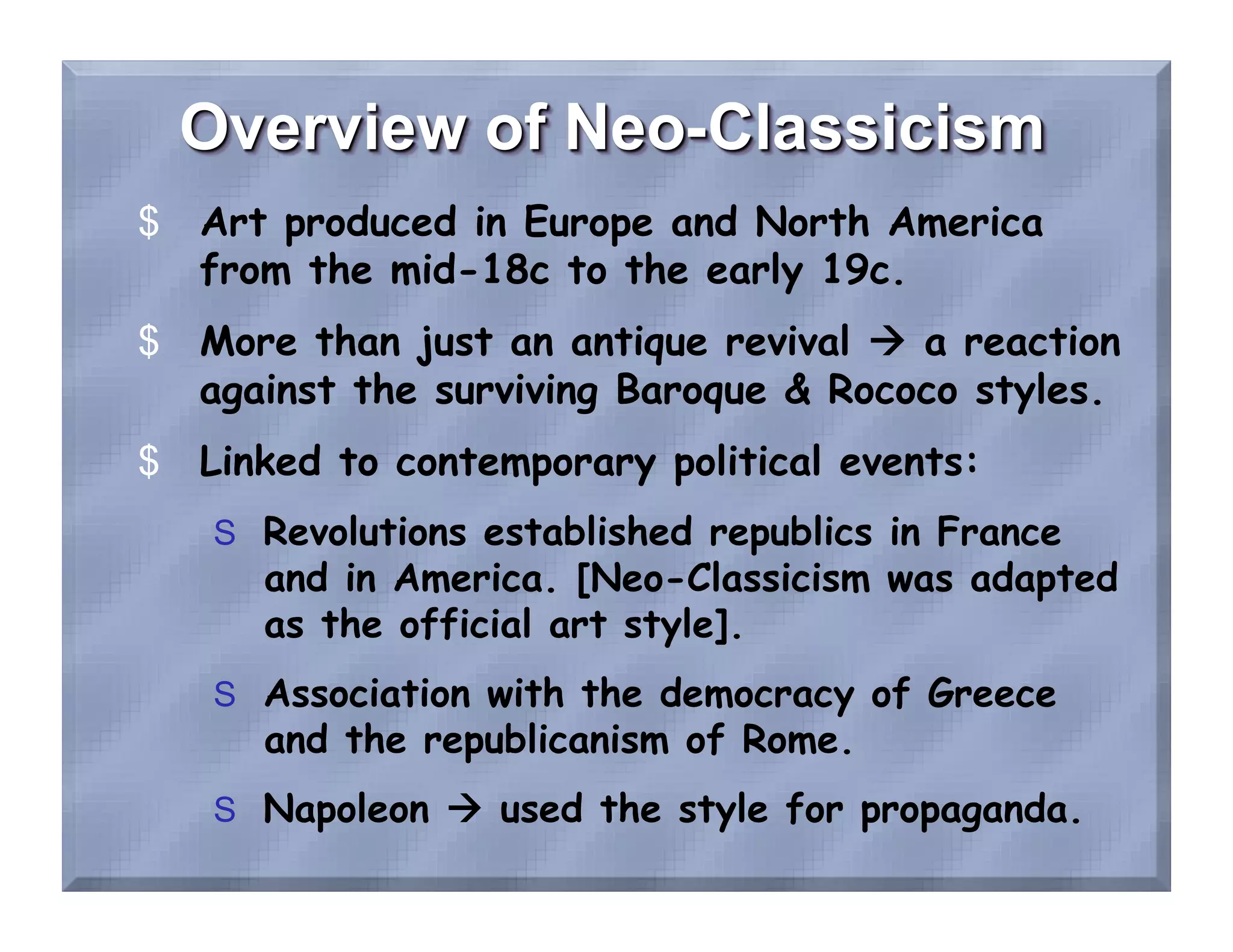 Neoclassicism was an artistic movement that began in the mid-18th century and lasted into the early 19th century. It drew inspiration from the perceived "purity" and ideals of classical antiquity, especially Ancient Greek and Roman art. Neoclassicism developed as a reaction against the ornate Baroque and Rococo styles, and it became associated with the democratic ideals of the American and French revolutions. Artists emphasized simplicity, nobility, and universal ideals through forms and motifs borrowed from classical antiquity. Neoclassicism went on to influence architecture, sculpture, painting and more across Europe and North America.