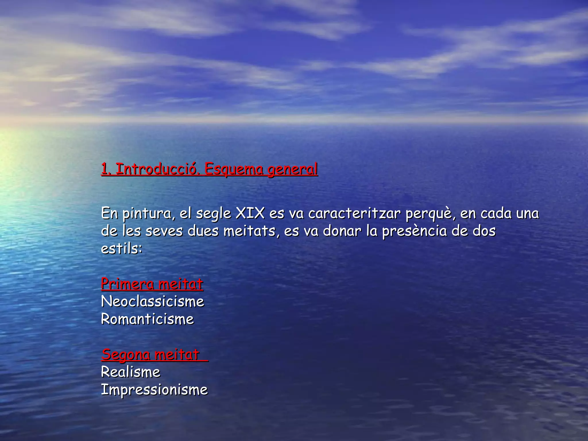1. Introducció. Esquemageneral En pintura, el segle XIX es va caracteritzar per què, en cada una de les seves dues meitats, es va donar la presència de dos estils: Primera meitat Neoclassicisme Romanticisme Segona meitat Realisme Impressionisme