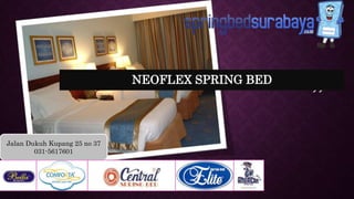 Dokumen ini menyediakan informasi tentang harga dan katalog berbagai jenis spring bed yang tersedia di lokasi Jalan Dukuh Kupang 25 No 37. Terdapat beberapa merek dan tipe spring bed, termasuk untuk anak-anak dan variasi modern. Untuk detail lebih lanjut, pengunjung diarahkan untuk melihat katalog secara online di situs www.springbedsurabaya.com.