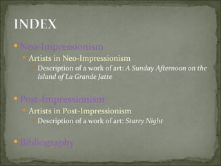 The document discusses Neo-Impressionism and Post-Impressionism. For Neo-Impressionism, it describes artists like Georges Seurat and Paul Signac and Seurat's famous painting "A Sunday Afternoon on the Island of La Grande Jatte". For Post-Impressionism, it discusses artists such as Vincent van Gogh, Paul Gauguin, and their notable works, with a focus on van Gogh's "Starry Night". It also provides background details on the techniques and time periods of each movement.