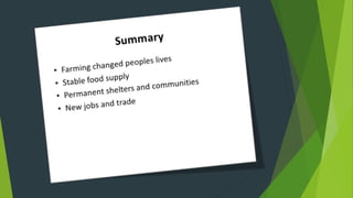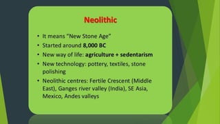 This document provides information about the Neolithic village of Skara Brae located in Scotland. It is considered Europe's most complete Neolithic village dating back to around 3100 BC. The village was uncovered in 1850 after a severe coastal storm and provides insight into the daily lives of people who lived during the Neolithic period in northern Europe.