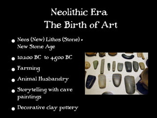 The document discusses Neolithic Era pottery and provides instructions for making a basic pinch pot. During the Neolithic Era from 10,200 to 4,500 BC, early humans developed farming, animal husbandry, cave paintings, and decorative clay pottery. The instructions show how to hand build a simple pinch pot in 6 steps: 1) roll clay into a ball, 2) pinch a hole through the center, 3) widen the hole by pinching, 4) smooth and thin the walls, 5) optionally add a tripod base, and 6) decorate with textures.