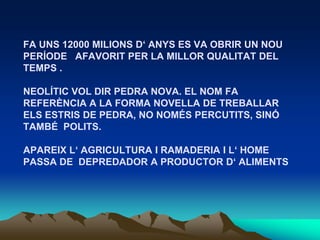 FA UNS 12000MILIONS D‘ ANYS ES VA OBRIR UN NOU PERÍODE AFAVORIT PER LA MILLOR QUALITAT DEL TEMPS .NEOLÍTIC VOL DIR PEDRA NOVA. EL NOM FA REFERÈNCIA A LA FORMA NOVELLA DE TREBALLAR ELS ESTRIS DE PEDRA, NO NOMÉS PERCUTITS, SINÓ TAMBÉ POLITS. APAREIX L‘ AGRICULTURA I RAMADERIA I L‘ HOME PASSA DE DEPREDADOR A PRODUCTOR D‘ ALIMENTS