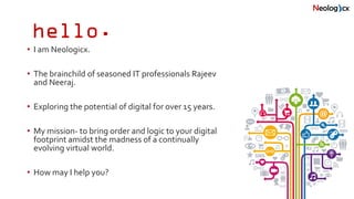 Neologicx, founded by experienced IT professionals Rajeev and Neeraj, specializes in enhancing digital footprints through a comprehensive suite of services including app development, SEO, and social media marketing. The company has worked with various clientele, focusing on innovative solutions like the Swachh Bharat Toilet Locator app and election commission apps to facilitate voter engagement. With a consultative approach, Neologicx aims to bring efficiency and technical expertise to its clients while building a strong digital presence.