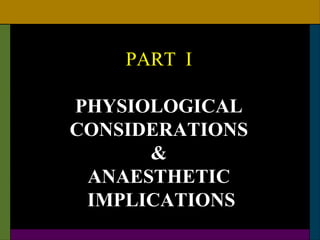 This document discusses neonatal surgical emergencies and anesthetic management considerations. It covers the physiological differences of the neonatal system including the cardiovascular, respiratory, renal and thermal regulation systems. It emphasizes the importance of maintaining normothermia, oxygenation, hydration and glucose levels. The document provides guidance on optimization, monitoring, induction, intubation, maintenance and recovery for neonatal anesthesia. Special attention is needed in the postoperative period to prevent complications like apnea, laryngospasm and cardiac arrest.