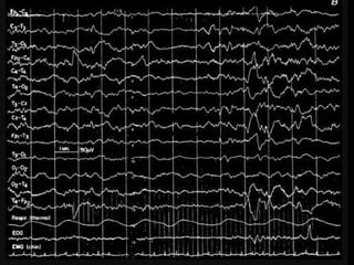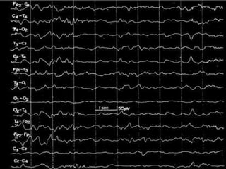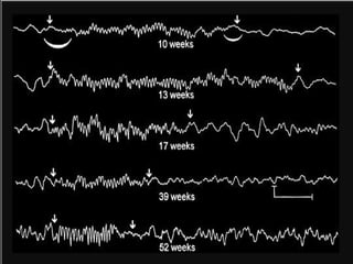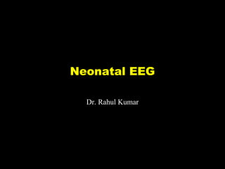 The document outlines the development of neonatal EEG patterns, detailing the transition from discontinuous to continuous activity as gestational age increases. Key features include the appearance of beta-delta complexes, temporal theta bursts, and frontal sharp waves, along with the reactivity to stimuli. The EEG maturation is described in terms of synchrony, voltage amplitude, and frequency patterns at various gestational and postnatal ages.