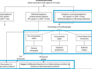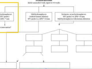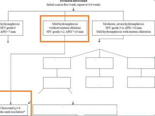 The document discusses the management of neonatal hydronephrosis, detailing causes, diagnostic evaluation, and treatment options. It highlights the importance of antenatal and postnatal ultrasound for assessing urinary tract anomalies and outlines guidelines for follow-up investigations such as voiding cystourethrography and renal scans. Management strategies, including indications for surgery and the use of prophylactic antibiotics, are also covered, emphasizing the need for careful evaluation of hydronephrosis severity and associated risks.
