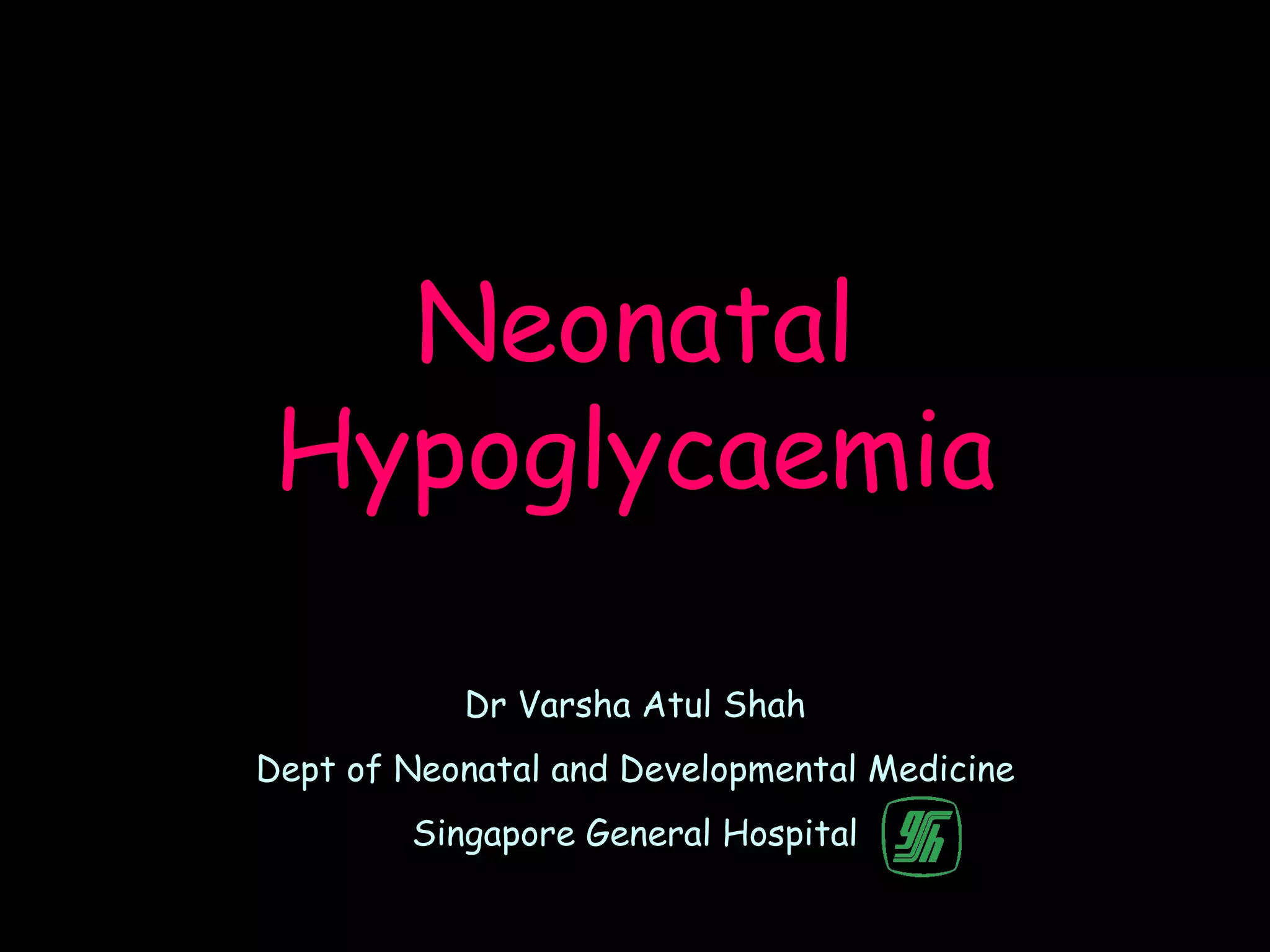 This document discusses neonatal hypoglycemia. It begins by defining neonatal hypoglycemia and noting the controversial operational thresholds used. It then describes the clinical features and various potential etiologies including increased glucose utilization, decreased production, prematurity, IUGR, and various stressors. The management sections cover prevention, anticipation through screening, diagnosis, treatment primarily with IV dextrose infusion, and adjunct therapies. It notes most cases resolve in 2-3 days but persistent or recurrent hypoglycemia may require further evaluation. The significance of hypoglycemia and potential long-term neurological outcomes are described depending on severity and duration. Long-term neurodevelopmental follow-up is recommended.