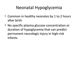 This document from the American Academy of Pediatrics provides guidelines on neonatal hypoglycemia. It states that hypoglycemia is common in healthy neonates in the first few hours after birth. The signs are non-specific and the Whipple triad must be fulfilled to attribute signs to hypoglycemia. Infants at risk include those that are small or large for gestational age, infants of diabetic mothers, or late-preterm. At risk infants should be screened in the first few hours and through multiple feed-fast cycles. Management includes a glucose bolus or continuous infusion to maintain plasma glucose between 40-50mg/dL.