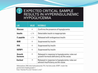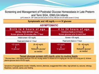 This document discusses the case of a term male infant born without complications who experienced episodes of hypoglycemia. At 2 hours of age he was jittery with a blood glucose of 35 mg/dL and improved after feeding. On the second day of life he again had low glucose of 35 mg/dL. At 2 weeks he presented with fussiness, jitteriness, staring spells, somnolence, and seizures with glucose less than 10 mg/dL, requiring IV glucose treatment. He continued having recurrent hypoglycemic episodes over the following weeks.