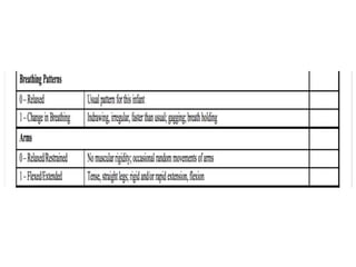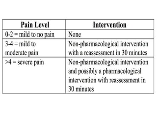 The Neonatal Infants Pain Scale (NIPS) is used to evaluate pain in infants less than one year old who cannot verbally communicate pain levels. It scores infants on a scale from 0-1 in categories like facial expressions, cry, breathing, and body movements to calculate a total pain score. A score over 3 typically indicates the infant is experiencing pain or discomfort. The scale was adapted from the CHEOPS scale and uses behaviors nurses describe as signs of infant pain. It can be used to monitor the effectiveness of pain interventions in young children.