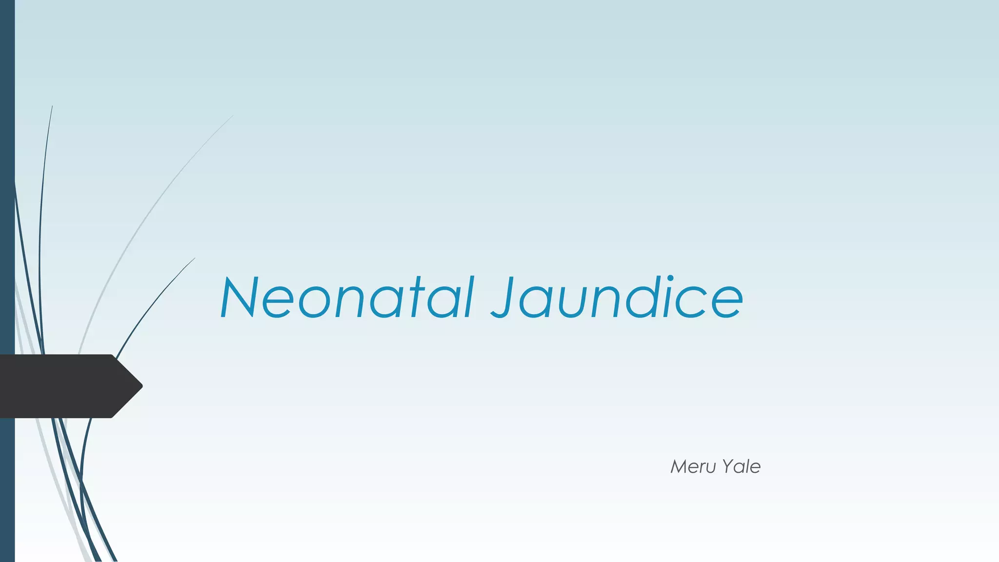Neonatal jaundice is a yellowish discoloration of the skin due to high bilirubin levels in newborns. Nearly 60% of term newborns experience jaundice in the first week of life. High bilirubin levels can be toxic to the developing brain. Jaundice is caused by physiological or pathological factors like blood incompatibilities or liver diseases. It is important to monitor bilirubin levels closely in newborns as severe jaundice can lead to kernicterus, a neurological condition causing cerebral palsy or hearing loss.