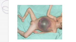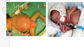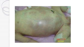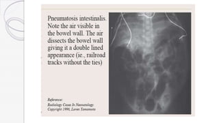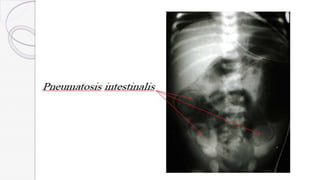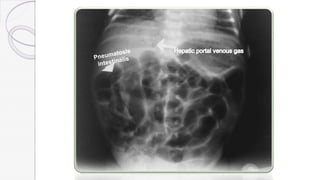 Necrotizing enterocolitis (NEC) is a life-threatening condition that affects the intestines of premature infants. It results from necrosis of the intestinal tissue and can range from mild to severe. Risk factors include prematurity, formula feeding, and bacterial or viral infections. Symptoms may include abdominal distension, bloody stools, and temperature instability. Diagnosis involves x-rays showing pneumatosis intestinalis or portal venous gas. Treatment focuses on gut rest, broad-spectrum antibiotics, surgery for perforation or failure to improve, and careful feeding advancement after recovery. Outcomes depend on severity but may include strictures, adhesions, or short bowel syndrome.