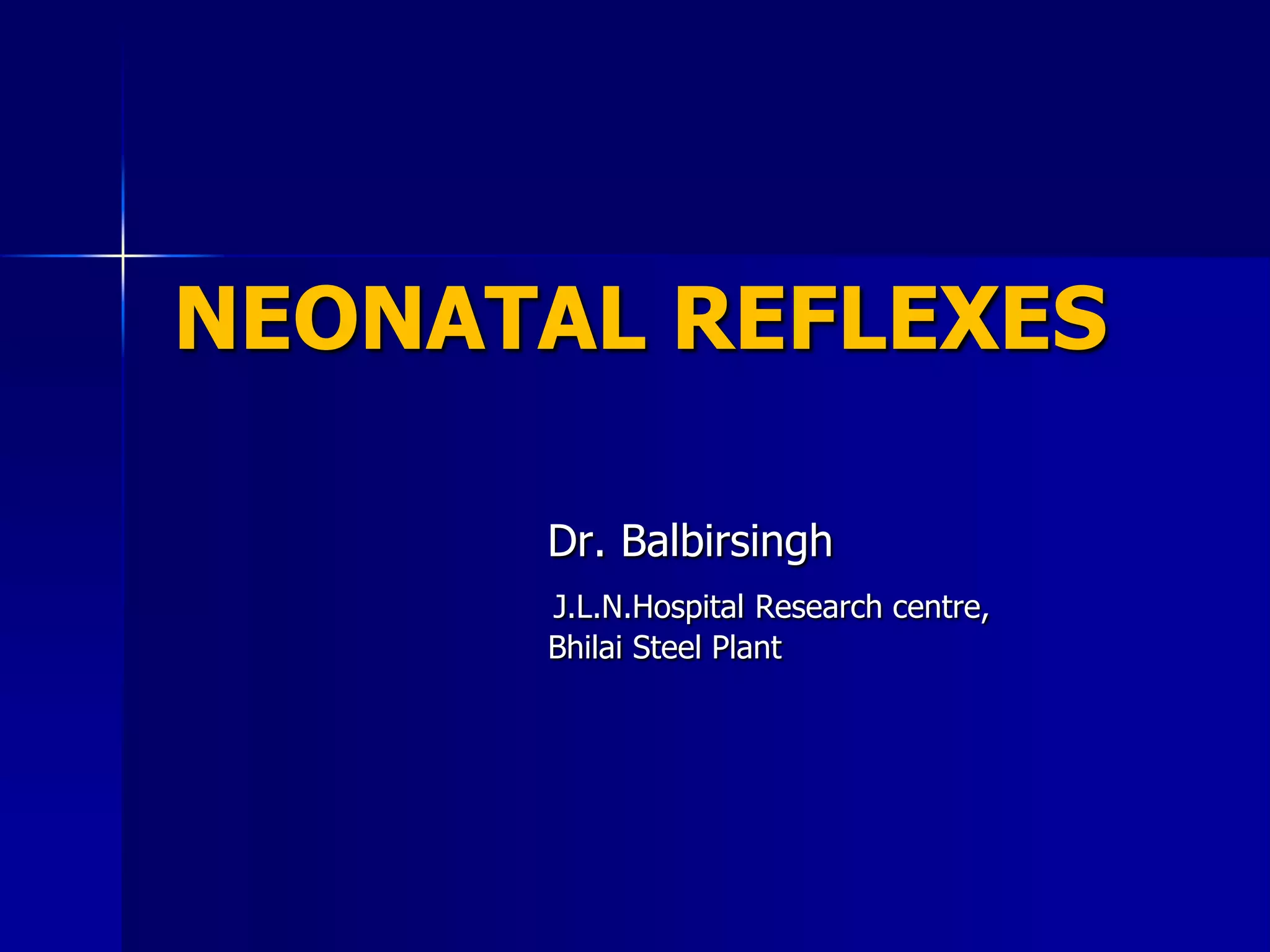 This document describes several neonatal reflexes present in newborn infants, including Moro's reflex, the palmar grasp, tonic neck reflex, rooting reflex, and sucking reflex. These reflexes are unconditioned responses to specific stimuli and help assess neurodevelopment. The document provides details on what elicits each reflex, the typical response, when they appear and disappear during development, and potential abnormalities if a reflex is absent, exaggerated, or persists beyond the normal timeframe. Understanding neonatal reflexes is important for evaluating infant development and identifying possible neurodevelopmental issues.