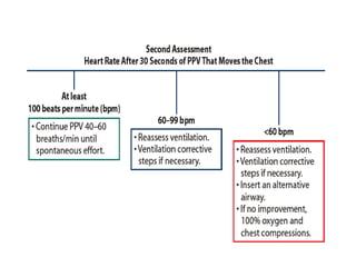 3. Effective neonatal resuscitation focuses on establishing ventilation through various airway techniques and devices while monitoring the baby's heart rate response. Chest compressions are indicated if the heart rate remains less than 60 bpm despite adequate ventilation efforts.