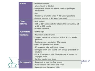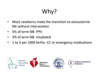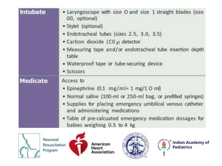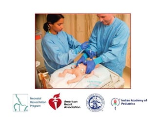 The document outlines the protocols and considerations of neonatal resuscitation as detailed in the 8th edition of the textbook by the American Academy of Pediatrics and American Heart Association. Key points include the importance of pre-birth preparation, ventilation techniques, administration of medications like epinephrine, and post-resuscitation care, emphasizing close monitoring and individualized assessment. Recommendations for umbilical cord management and the significance of timely interventions are highlighted throughout.