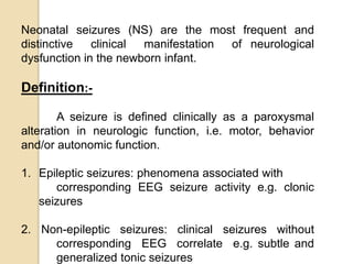 This document discusses protocols for treating neonatal seizures. It defines seizures and classifies them as epileptic, non-epileptic, or EEG-only seizures. It describes different types of seizures including subtle, clonic, tonic, and myoclonic seizures. It then outlines the AIIMS, IAP, and Nelson protocols for treating neonatal seizures, which involve maintaining vital signs, checking glucose, administering anti-seizure medications like phenobarbital and phenytoin, and in refractory cases using additional medications. It provides guidance on weaning anti-seizure medications and monitoring the infant neurologically before discharge.
