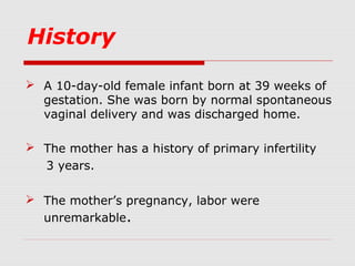 This document describes the case of a 10-day-old infant presenting with signs of shock including tachycardia, poor perfusion, and decreased urine output. Examinations revealed hepatomegaly and other signs suggestive of shock. Investigations showed metabolic acidosis and low blood sugar. The infant did not respond to initial fluid resuscitation and inotropic support. Echocardiogram revealed hypoplastic left heart syndrome. Prostaglandin E1 was started and the infant responded, confirming duct-dependent systemic circulation. The case highlights the importance of early recognition and management of neonatal shock.