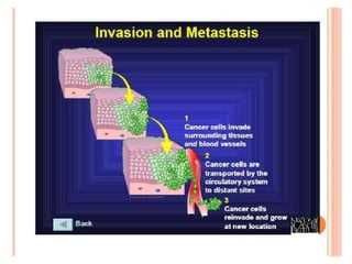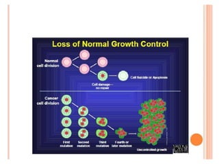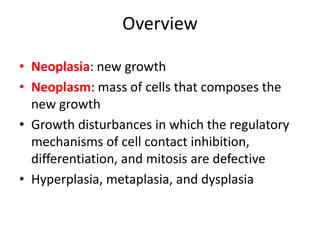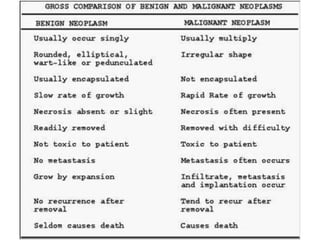 This document discusses neoplasms (abnormal masses of cells). It defines benign and malignant neoplasms, with benign being slow-growing and non-metastasizing, while malignant are fast-growing and can metastasize. Malignant neoplasms vary in differentiation from well to poorly differentiated. The prognosis depends on factors like growth rate, size, site, cell type, differentiation, metastasis, and response to therapy.