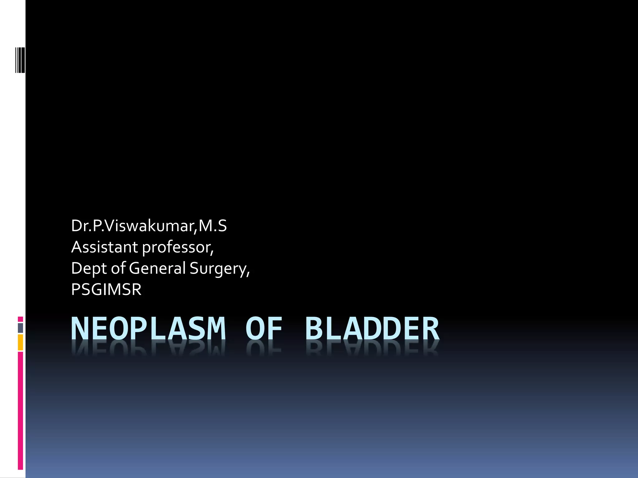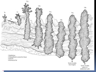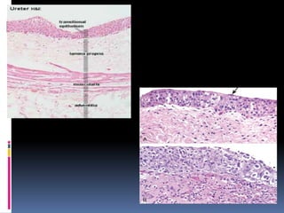 The document discusses the anatomy and histology of the bladder and various benign and malignant tumors that can occur. It provides details on: