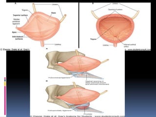 1. The anatomy of the bladder including its shape, surfaces and location in the pelvis.