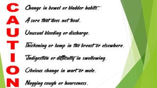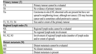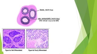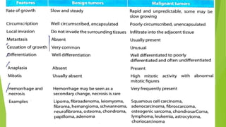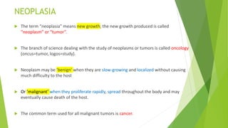 This document discusses benign and malignant tumors. It defines neoplasia as new abnormal growth and divides tumors into benign and malignant. Benign tumors are slow-growing, localized masses that are not life-threatening, while malignant tumors rapidly proliferate, invade surrounding tissues, and metastasize to distant sites, potentially causing death. Malignant tumors are also known as cancers. The document describes characteristics of benign versus malignant tumors such as growth rate, circumscription, differentiation, and metastasis. It also lists factors that can predispose individuals to developing neoplasms.