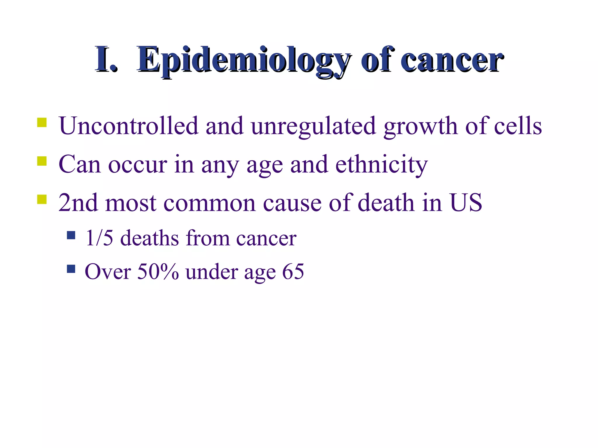 This document provides information on cancer and its management. It discusses the epidemiology of cancer, mechanisms of tumor development and progression, characteristics of benign and malignant tumors, risk factors for cancer, methods for cancer prevention and screening, ways to classify cancers, and major treatment options. The key treatment options discussed are surgery, radiation therapy, chemotherapy, and hormonal therapy.