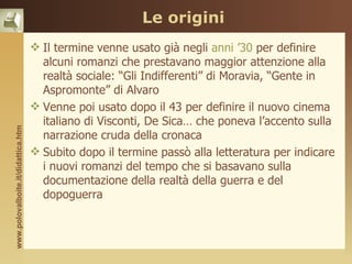 Il neorealismo, emerso tra il 1945 e il 1955, è un movimento culturale italiano che si oppone al fascismo e si concentra sulle difficoltà sociali del dopoguerra. Esprime un impegno intellettuale attraverso letteratura e cinema, enfatizzando temi come la guerra, la povertà e la resistenza, con un linguaggio accessibile che riflette la realtà popolare. Tra gli autori principali ci sono Pasolini, De Sica e Vittorini, con opere che rompono con le tradizioni precedenti, cercando una nuova forma di espressione artistica e culturale.