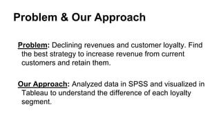 The document summarizes a company's analysis of customer loyalty segments to determine the best marketing strategy to increase revenue. It finds that the silver segment has the most customers but the lowest spending, while the gold segment has the fewest customers but the highest spending. It then proposes a multi-channel marketing campaign focused on direct mail, web, and point-of-sale promotions for gold and silver customers, particularly for electronic and book products. The document acknowledges limitations in the data provided and suggests the segments may need re-evaluating over time as the industry evolves.