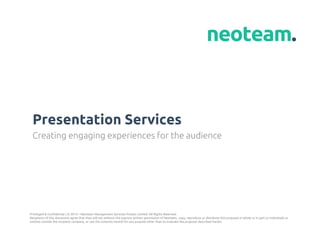 Neoteam offers presentation services including PowerPoint slide production, template design, and animation. Their methodology involves scoping the project, analyzing source documents and data, developing a storyline and structure, and creating visual slides. They aim to enhance clients' communication and impact with audiences through compelling presentation design that simplifies complex information. Samples shown include presentations for business proposals, trade shows, case studies, and more.