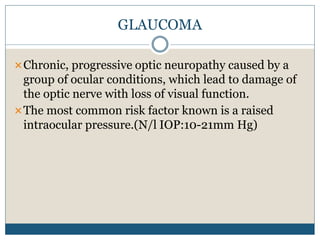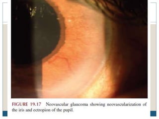 This document discusses neovascular glaucoma (NVG), a type of secondary glaucoma caused by the growth of new blood vessels on the iris and in the anterior chamber angle due to extensive retinal ischemia. NVG is preceded by rubeosis iridis, where new vessels arise from the iris microvasculature. The new vessels can cause open-angle or angle-closure glaucoma by pulling on surrounding structures. Common causes are diabetic retinopathy, central retinal vein occlusion, and other conditions leading to retinal ischemia. Patients present with pain, redness, blurred vision and elevated intraocular pressure. Treatment involves panretinal photocoagulation, anti-VEGF injections, glaucoma medications and