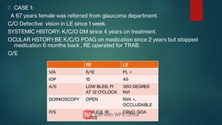 The document presents multiple cases of neovascular glaucoma (NVG) and discusses its diagnosis, management, and associated risk factors. Key causes of NVG identified include proliferative diabetic retinopathy, retinal vein occlusion, and ocular ischemic syndrome, with management often involving interventions like laser photocoagulation and intravitreal injections. The document also highlights the pathophysiology and clinical stages of NVG, emphasizing the importance of early detection and treatment to prevent severe vision impairment.