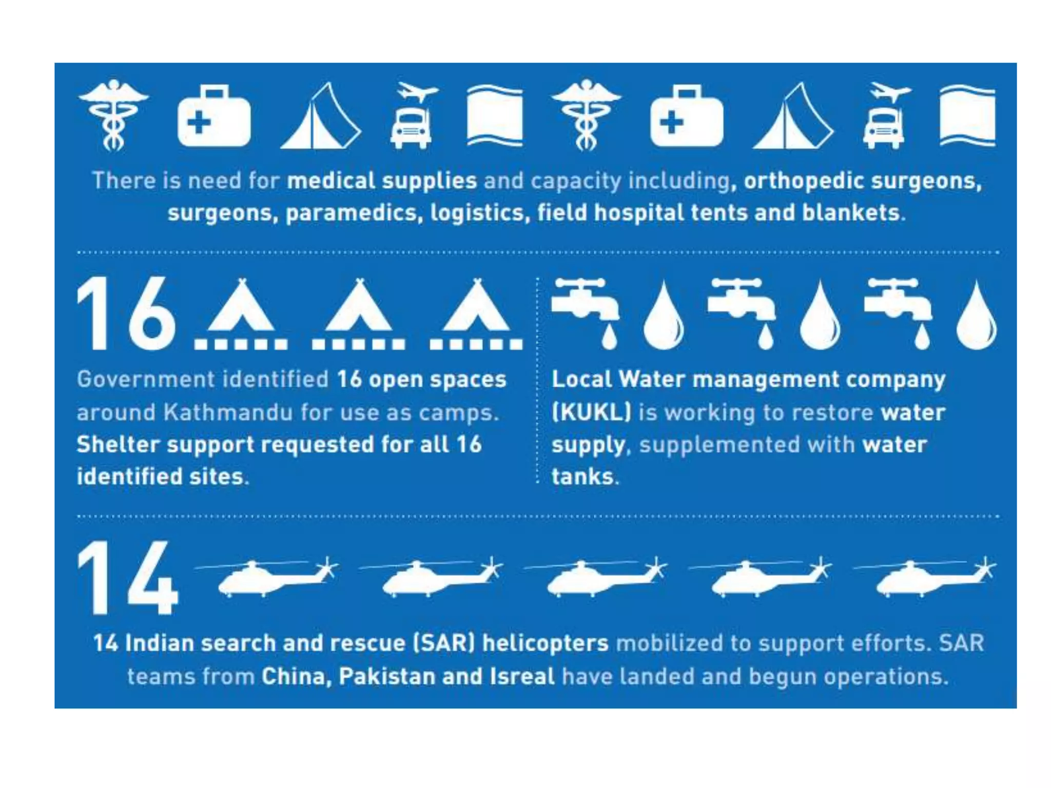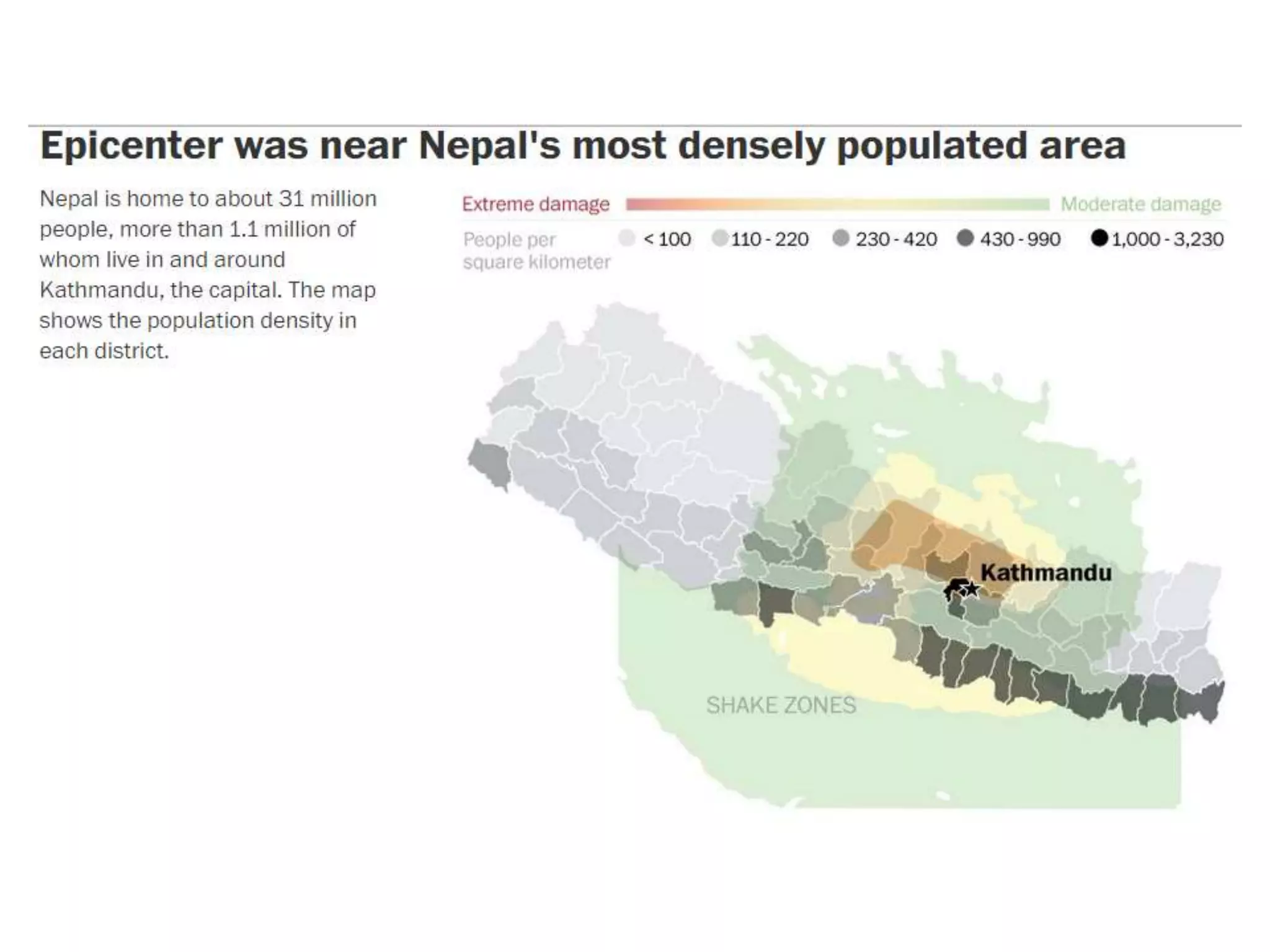 Many countries and non-governmental organizations (NGOs) sent aid to Nepal over the weekend following a 7.8 magnitude earthquake centered near Kathmandu. An NGO is a non-profit organization that provides services and aid. Nepal, with a population of 28 million people and limited resources, struggled to deal with the devastating impacts of the earthquake alone, which included widespread damage and destruction in Kathmandu as well as landslides and avalanches in mountainous regions. International aid was sent to assist with emergency relief and recovery efforts.