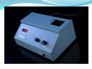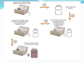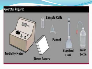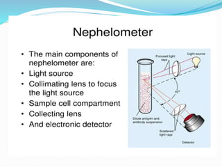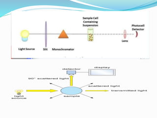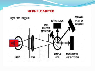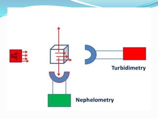 Nephlometry and turbidimetry are analytical techniques that measure scattered or transmitted light to determine the concentration of suspended particles in a solution. Nephlometry measures scattered light at low concentrations, while turbidimetry measures transmitted light at high concentrations. Choice of method depends on particle concentration. Several factors influence scattering and must be controlled, like particle size and shape, wavelength used, and difference in refractive indices. Instruments include nephelometers, turbidimeters, and combined nephlo-turbidimeters. These techniques are used to analyze substances in water, determine ions through precipitation, and quantify analytes in various industrial applications.