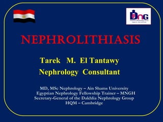 Nephrolithiasis, or kidney stones, is a common condition where stones form in the kidneys or urinary tract. The prevalence increases with age, affecting 11% of men and 5.6% of women in the US by age 70. Calcium oxalate and calcium phosphate are the most common stone types. Risk factors include genetics, medical conditions like obesity and hyperparathyroidism, dietary factors high in sodium and animal protein, and low urine volume. Patients typically present with sudden severe flank or abdominal pain known as renal colic. Diagnosis involves urinalysis, blood tests, abdominal imaging like CT, and stone analysis if a sample can be obtained. Treatment depends on factors like stone size,