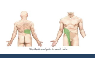 The document discusses nephrolithiasis, including its epidemiology, types of kidney stones, clinical presentation, diagnosis, treatment, and prognosis. It highlights risk factors such as high calcium levels and low urine volume, elaborates on various stone types (calcium, struvite, uric acid, cystine), and outlines treatment options based on stone size and complications. Additionally, it emphasizes the importance of hydration and dietary management in stone prevention.