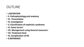 Nephrotic syndrome is a condition characterized by heavy proteinuria, hypoalbuminemia, edema, and hyperlipidemia. It is caused by damage to the glomerular capillary wall that increases permeability and allows large molecules like albumin to pass into the urine. The main types are minimal change disease, focal segmental glomerulosclerosis, and membranous glomerulonephritis. Treatment involves managing edema, restricting protein intake, and potentially using steroids, immunosuppressants, or diuretics depending on the specific cause and severity. Complications can include infection, thrombosis, hyperlipidemia, and end-stage renal disease if left untreated.