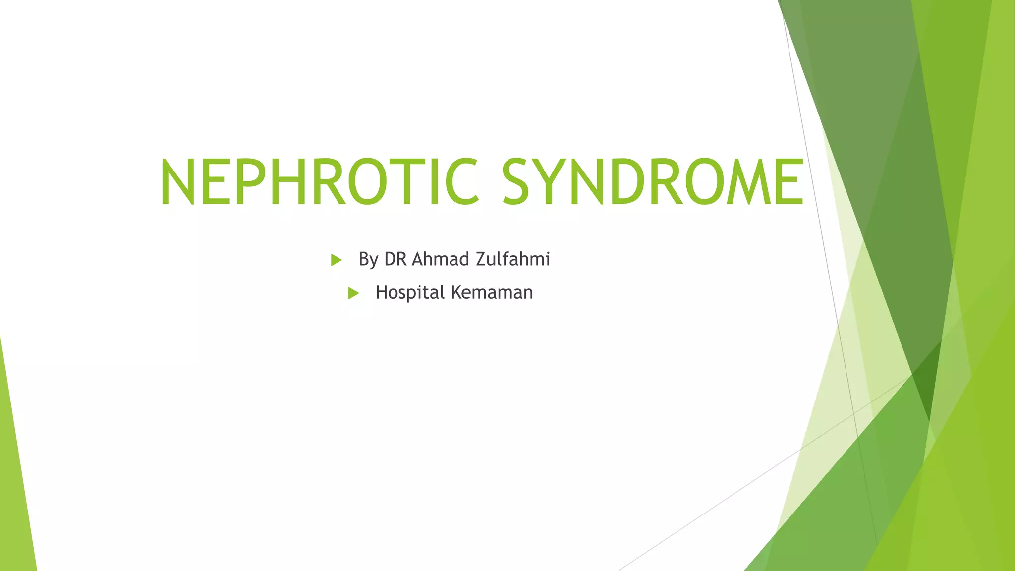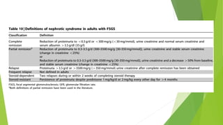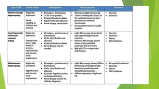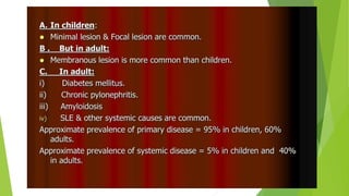 Nephrotic syndrome affects 1-3 per 100,000 children below age 16. It is most commonly caused by minimal change disease in children, responding to corticosteroid therapy in 80% of cases. A kidney biopsy is generally not required initially as most children will respond to corticosteroids. For steroid-sensitive nephrotic syndrome, treatment involves prednisone for 12 weeks including 4-6 weeks daily followed by alternate-day dosing for 2-5 months. Frequently relapsing or steroid-dependent cases may be treated with corticosteroid-sparing agents such as cyclophosphamide, levamisole, or calcineurin inhibitors.