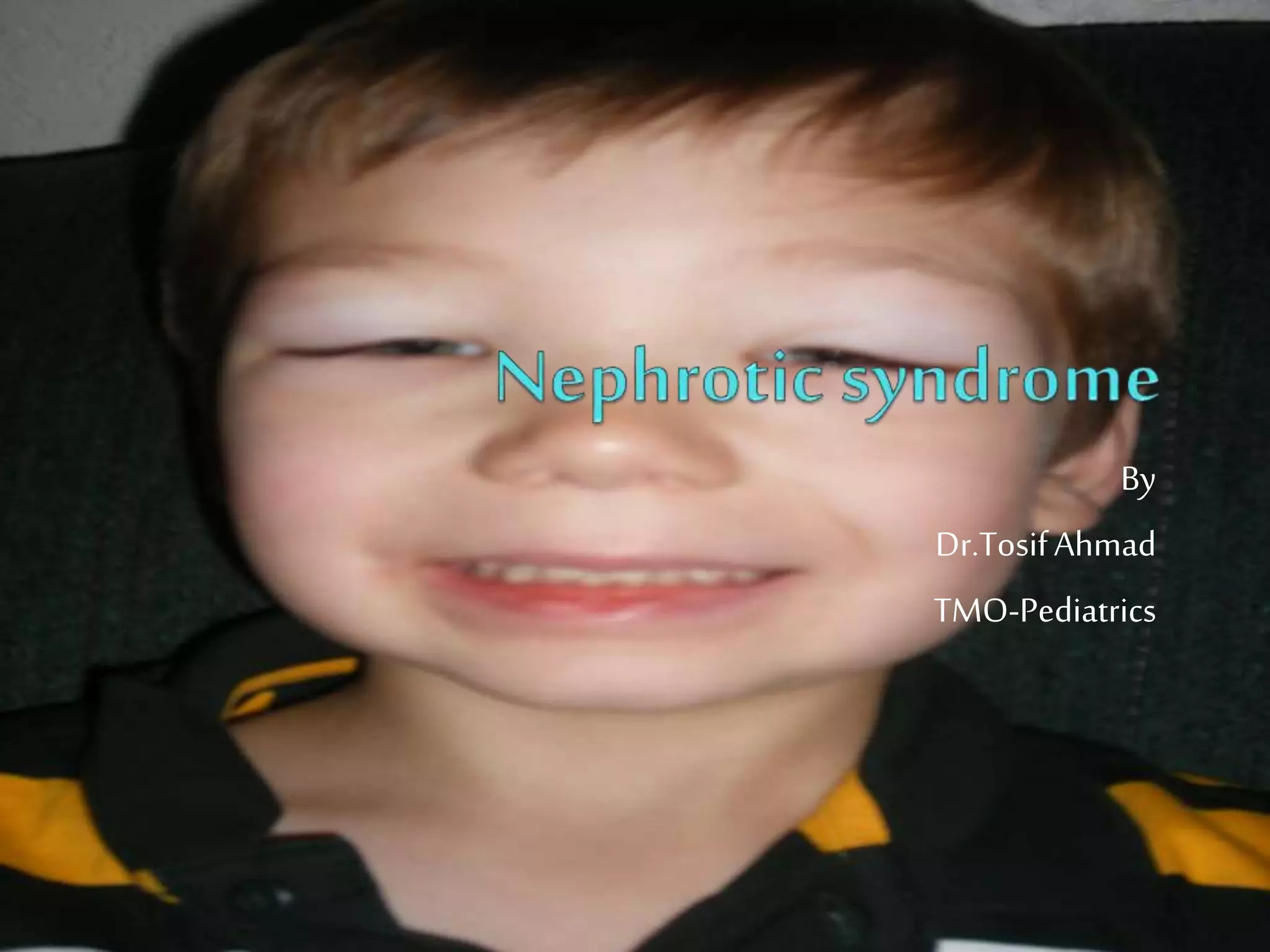 A 3-year-old boy presented with puffy eyes and edema. Examination found pitting edema, elevated heart rate, and proteinuria. Tests showed normal kidney and liver function. He was diagnosed with nephrotic syndrome based on his symptoms and urine protein level. Nephrotic syndrome is characterized by protein in the urine and symptoms of edema, low albumin, and high cholesterol or lipids. The majority of cases in children are idiopathic and due to minimal change disease. Treatment involves supportive care, steroids, and other medications depending on response and side effects.