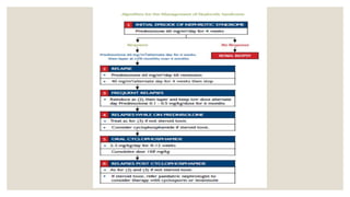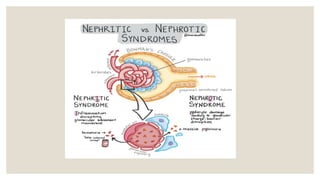 This document provides information about nephrotic syndrome including its definition, causes, signs and symptoms, investigations, management, and complications. Nephrotic syndrome is characterized by proteinuria, hypoalbuminemia, edema, and hyperlipidemia. It can be caused by primary/idiopathic conditions like minimal change disease or secondary causes such as SLE, diabetes, or drugs. Management involves dietary modifications, diuretics, steroid therapy, and immunosuppressive drugs depending on disease severity and response to treatment. Complications include thrombosis, peritonitis, and hypovolemia which require prompt intervention.