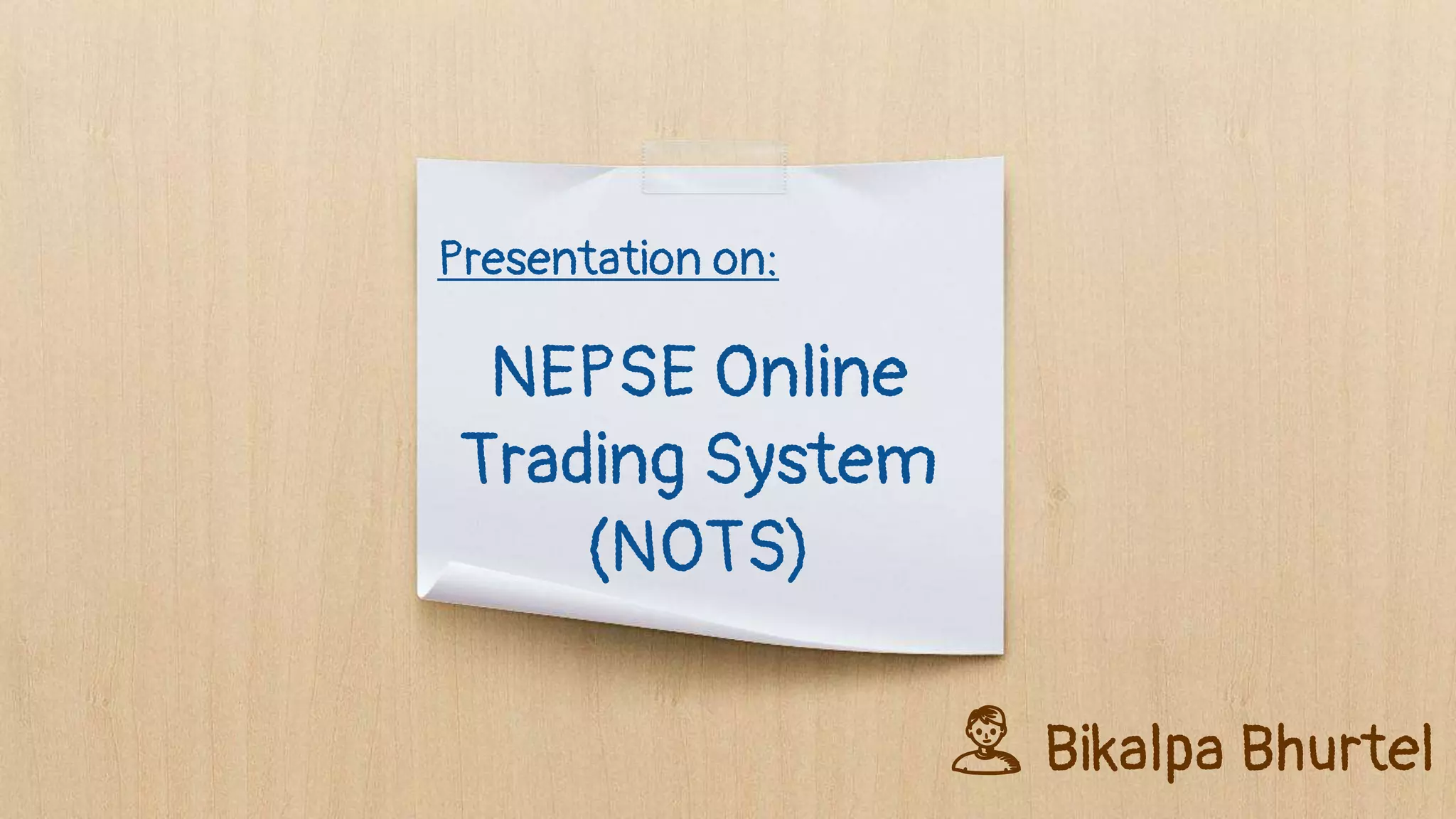 Mr. Bikalpa Bhurtel gave a presentation on the NEPSE Online Trading System (NOTS) which allows for online share trading in Nepal. The presentation covered introductions to securities and NOTS, basic trading terms, the overall share transaction process in Nepal, and how online trading works. NOTS facilitates automated online trading through a broker's trading management system and virtual private network connected to NEPSE. It allows buyers and sellers to place orders that are matched and processed, with partially filled orders allowed. Open orders can be edited or cancelled at the end of the trading day when all unmatched orders are cancelled.