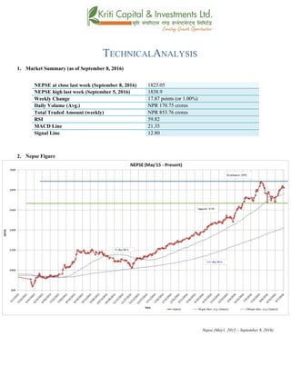 The Nepse index gained 17.87 points last week to close at 1823.05, supported by dividend announcements from listed companies. Technical indicators like MACD and RSI show the market has bullish momentum. The index is trading above its 50-day and 200-day moving averages, suggesting an optimistic outlook. Support remains at 1680 with resistance at 1880, above which the index is expected to move in the coming days given ongoing positive sentiment.