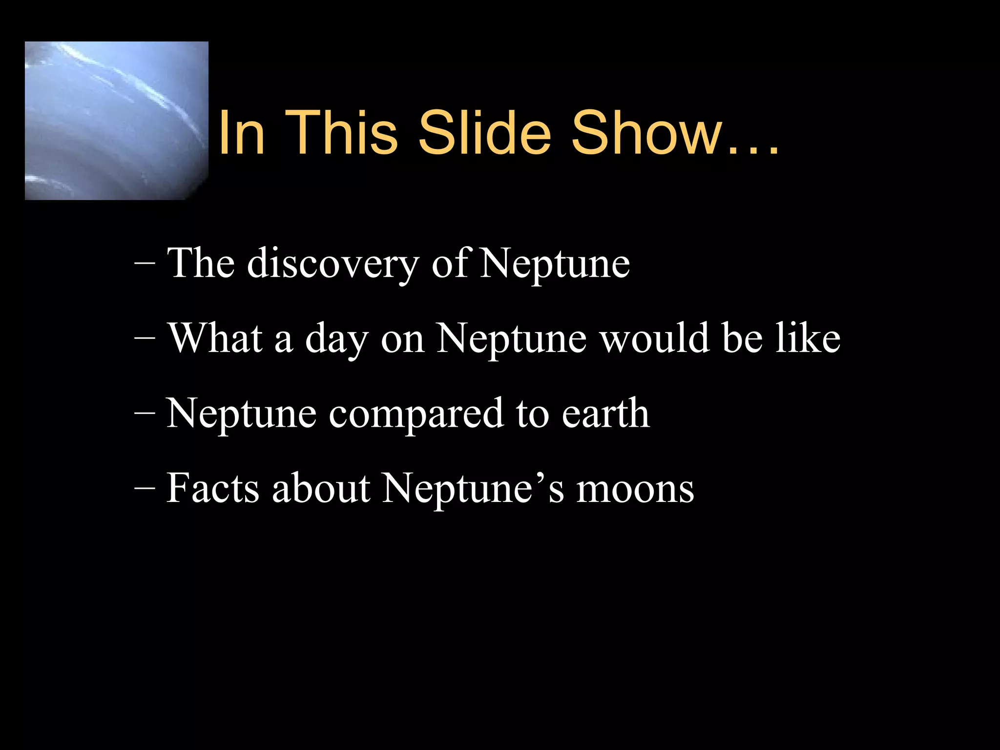 Neptune is the eighth and farthest known planet from the Sun in our solar system. It was discovered in 1846 based on calculations that something was affecting the orbit of Uranus. Neptune is mostly made of hydrogen, helium and methane gas, and is about four times larger than Earth. It has eight known moons, including its largest moon Triton, and takes over 165 years to complete one orbit around the Sun.
