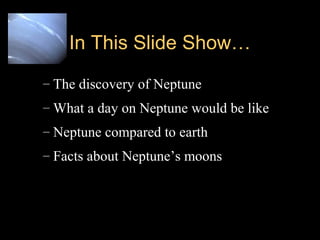 Scientists discovered Neptune in 1846 after noticing irregularities in Uranus's orbit that suggested another planet was perturbing it. Neptune is composed primarily of hydrogen, helium and methane gas. It has a diameter of about 49,500 kilometers and takes 165 years to orbit the sun once. Neptune has eight known moons, with Triton being the largest and coldest, with an average temperature of -235 degrees Celsius.
