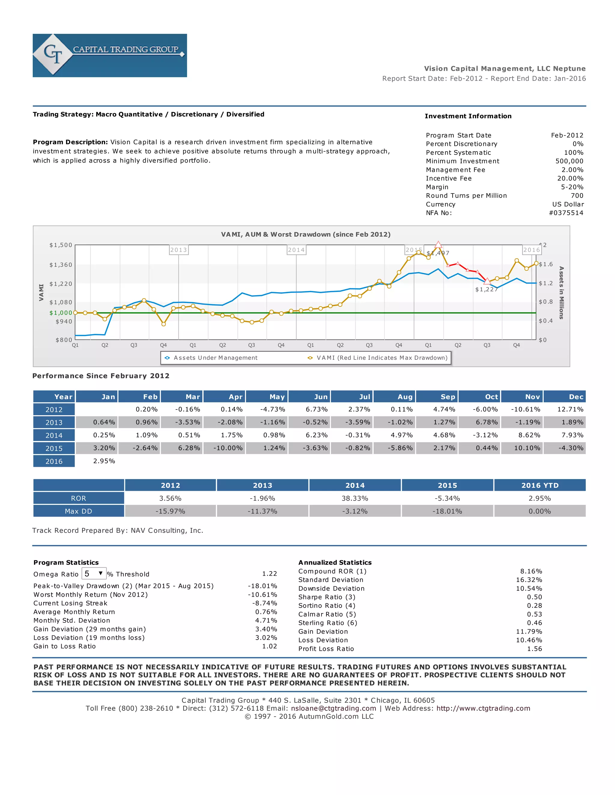 Vision Capital is a research-driven investment firm that seeks positive absolute returns through a diversified, multi-strategy approach. The firm has been in operation since February 2012, employs a 100% systematic trading strategy across a highly diversified portfolio, and has achieved an annualized return of 8.16% with moderate risk levels as measured by standard deviation and drawdown metrics.