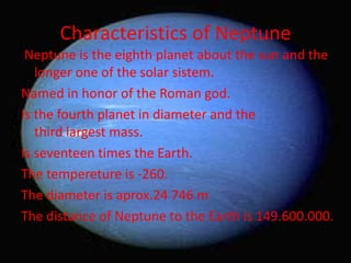 Neptune is the eighth planet from the sun, named after the Roman god of the sea. It is the fourth largest planet by diameter and third largest by mass, about 17 times the size of Earth. Neptune is composed primarily of water, methane and ammonia and has a distinctive blue color. It has 13 known moons, the largest being Triton. Neptune was discovered in 1846 and is located an average distance of about 2.8 billion miles from the sun.
