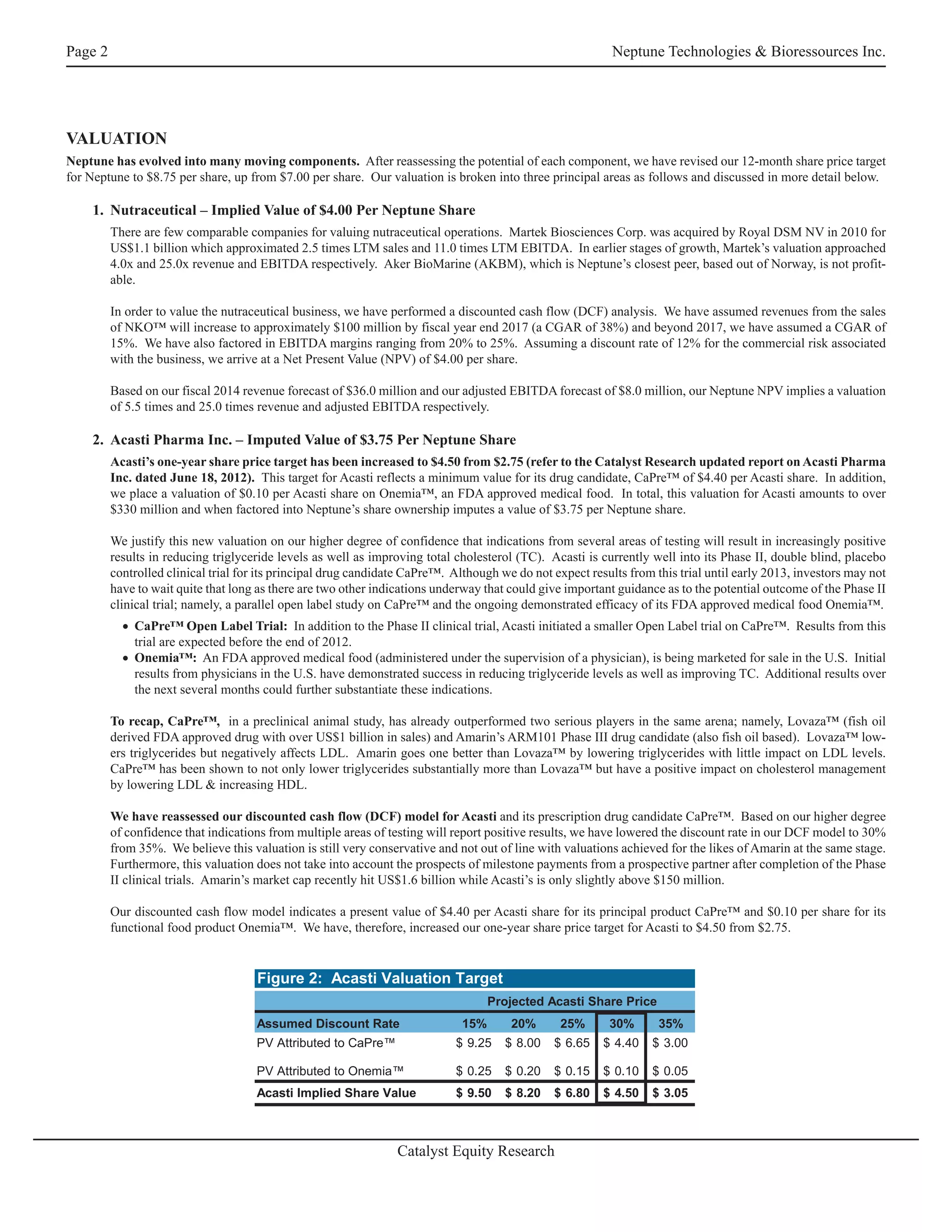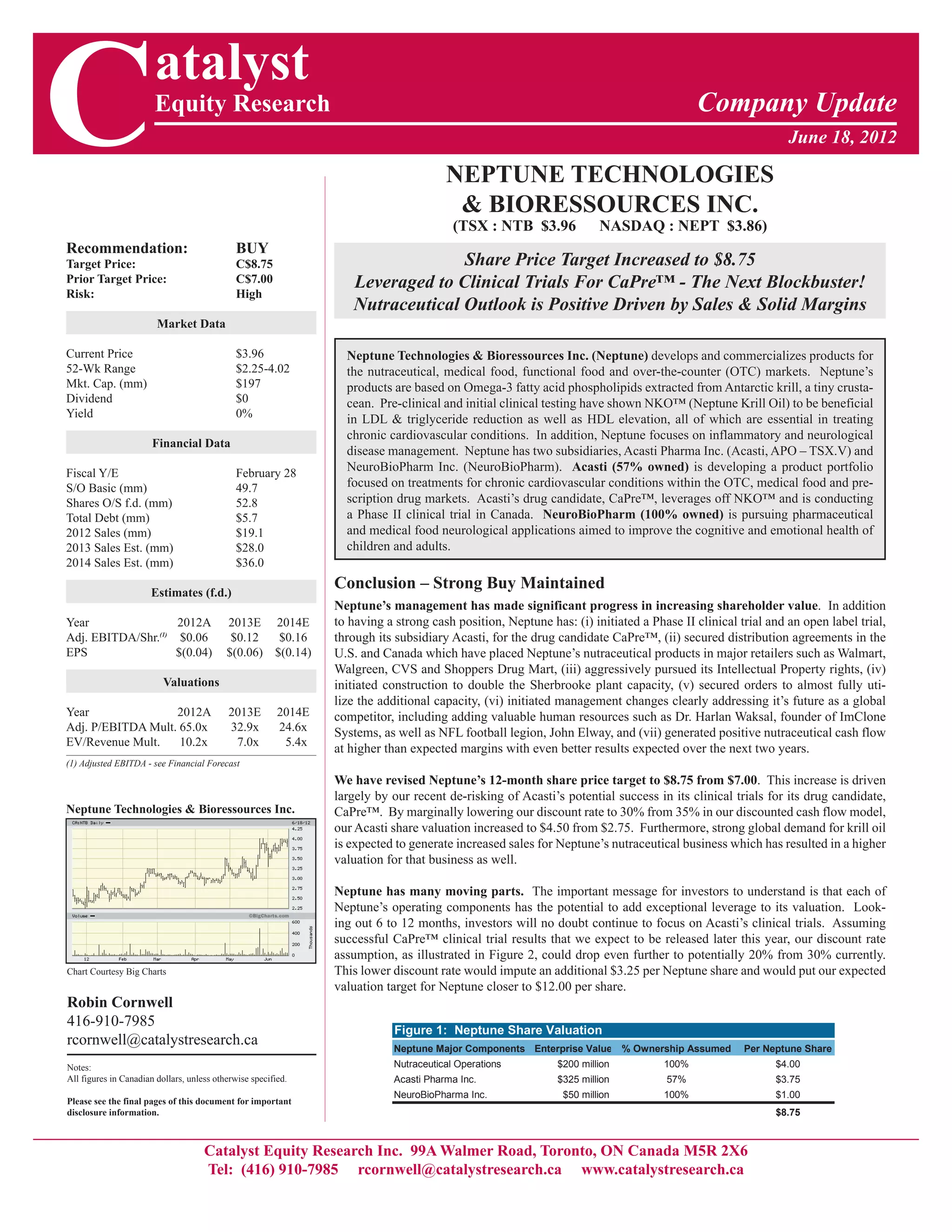 - The document is a company update and recommendation report by Catalyst Equity Research on Neptune Technologies & Bioressources Inc.