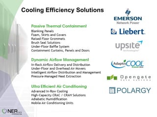 The document outlines various containment and cooling efficiency solutions for data centers aimed at enhancing airflow, preventing bypass airflow, and improving cooling capacity. It highlights specific products and designs, including custom panels, swing doors, and innovative systems like demand-based cooling, as part of broader efficiency initiatives. These solutions often involve custom design and can also qualify for utility incentive projects.